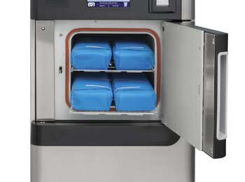 Sterilizační přístroj na bázi odpařování peroxidu vodíku určený kapacitou a výkonem pro reprocesing operačních nástrojů zdravotnických zařízení.